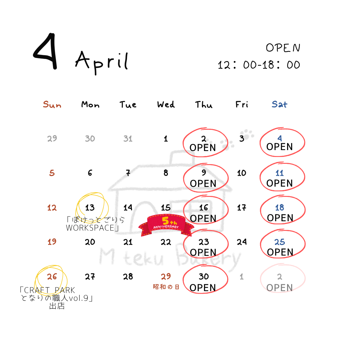 4月は、カレンダーどおり、木曜・土曜の12:00~オープンいたします。